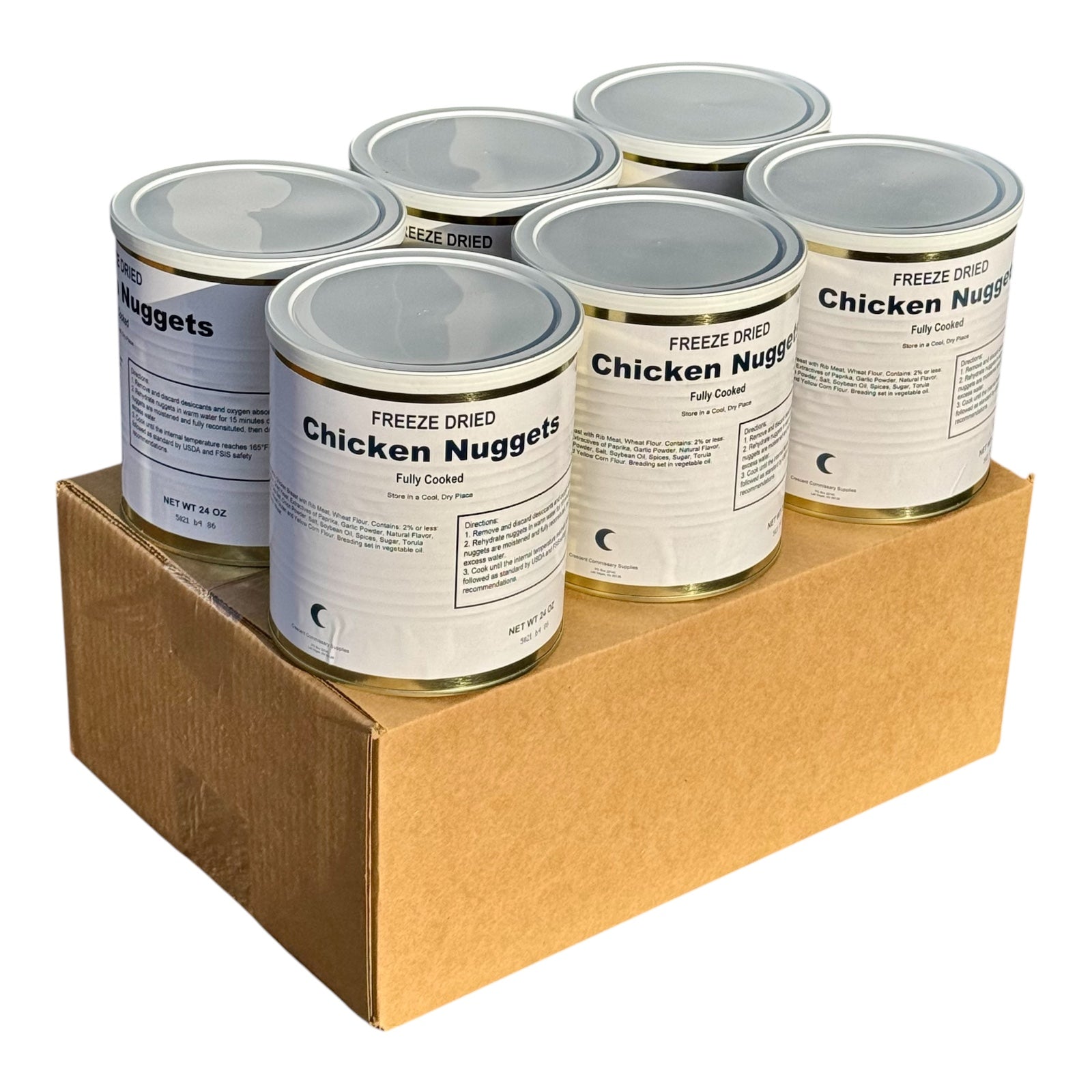 All cans were sealed in an oxygen/moisture free environment. Each can weighs 24 oz (1.5 lbs) and contains 80 to 90 chicken nuggets.