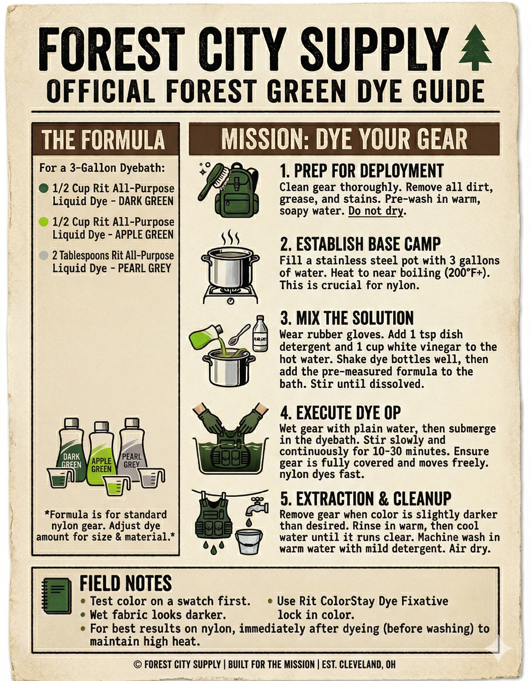 Get the deep, enduring color of the forest with this custom dye bundle from Forest City Supply. Crafted for durability and precision, this kit is your go-to solution for dyeing gear to an official Forest Green hue. This formula is ideal for creating a mission-ready look on nylon and other fabrics.
